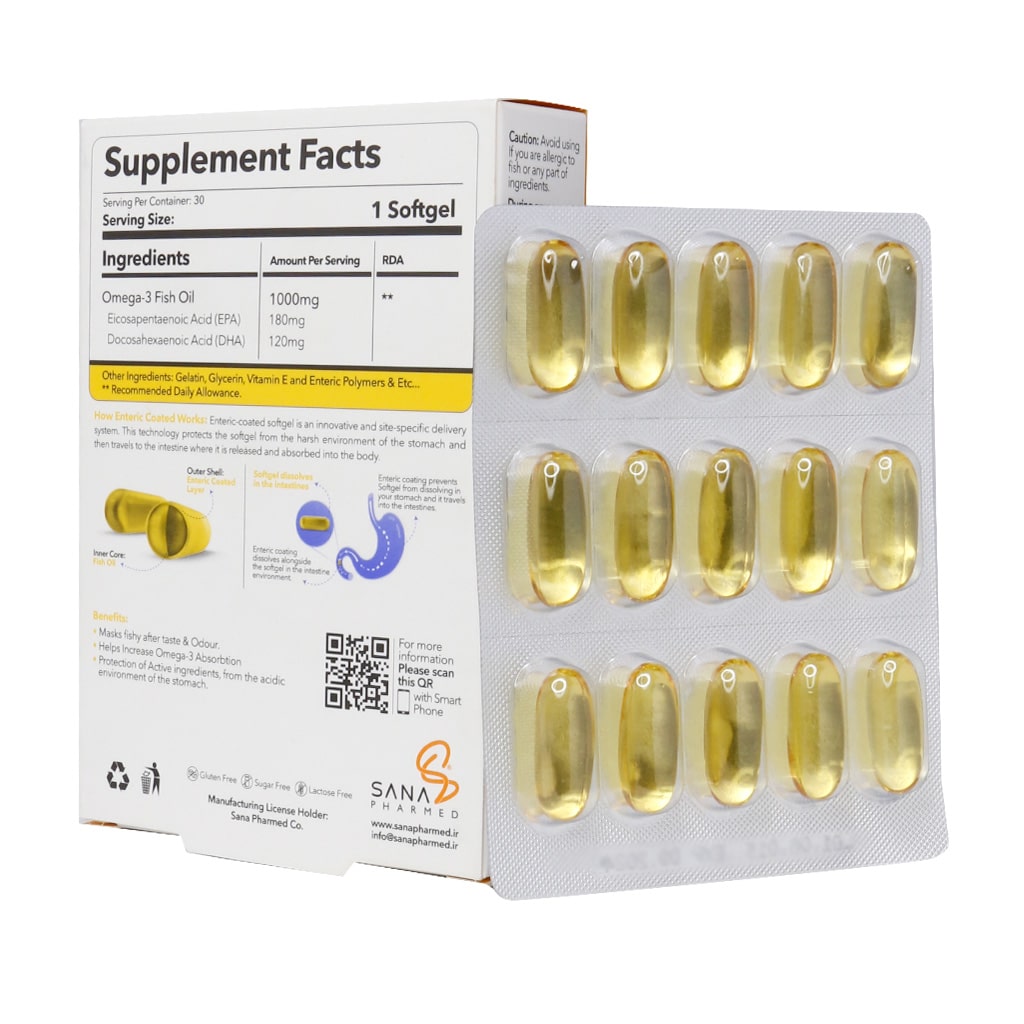 این مکمل با پوشش انتریک (Enteric-Coated) تولید شده است که باعث میشود سافت ژل در روده کوچک باز شود، نه در معده، تا جذب بهینهتر امگا-۳ و کاهش طعم یا بو نامطلوب روغن ماهی به حداقل برسد.