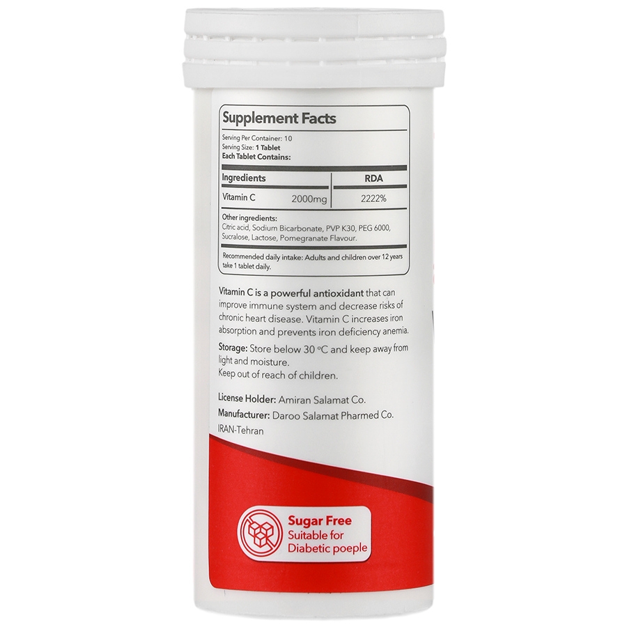 ویتامین C (اسید اسکوربیک) ۲۰۰۰ میلیگرم – آنتیاکسیدان قوی، تقویت سیستم ایمنی، کمک به تولید و بازسازی کلاژن، محافظت در برابر آسیب سلولی.