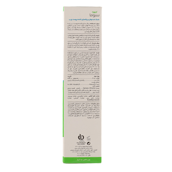 همچنین ترکیباتی مانند اسید سالیسیلیک، عصاره شیرین‌بیان، زرشک، عصاره چای سبز و آویشن در این ماسک باعث لایه‌برداری ملایم پوست، کاهش باکتری‌ها، و تسکین التهابات ناشی از جوش می‌شوند. استفاده منظم از ماسک سبوما باعث کاهش جوش‌های سرسیاه و سرسفید، کاهش براقیت پوست و یکنواخت شدن رنگ پوست می‌گردد؛ این محصول ضمن پاکسازی منافذ، به ترمیم پوست، کاهش قرمزی و روشن‌ شدن کمک می‌کند.