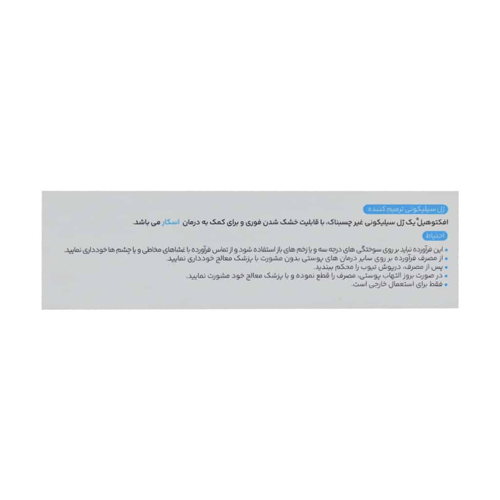 ژل افکتوهیل با ترکیبی از دایمتیکون و دایمتیکون کراسپلیمر، پلیدیمتیل سیلوکسان، تریمتیل سیلوگزی سیلیکات، پروپیلن گلایکول و دکسپانتنول فرمول شده است. سیلیکونها به عنوان لایه محافظ روی سطح پوست عمل کرده و با حفظ رطوبت و ایجاد محیط مرطوب، فرآیند بهبود طبیعی پوست را تسریع میکنند. این ترکیب باعث کاهش خارش، سوزش و کشیدگی پوست اطراف جای زخم میشود و از ضخیم شدن بیش از حد اسکار جلوگیری میکند.