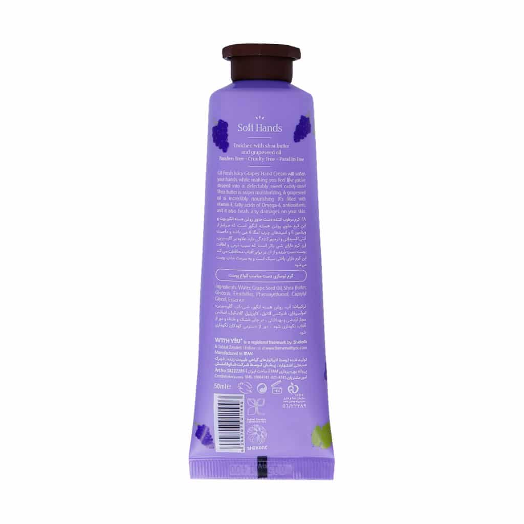 کرم دست حاوی روغن هسته انگور ویت یو (With You) یک محصول مراقبتی تخصصی برای حفظ رطوبت، نرمی و سلامت پوست دست است که با بهرهگیری از ترکیبات گیاهی و مغذی، بهطور مؤثر خشکی و زبری پوست را کاهش میدهد. این کرم بافتی سبک، غیرچرب و جذب سریع دارد و برای استفاده روزانه طراحی شده است؛ بهگونهای که پس از استفاده، احساس سنگینی یا چسبندگی روی پوست باقی نمیگذارد.